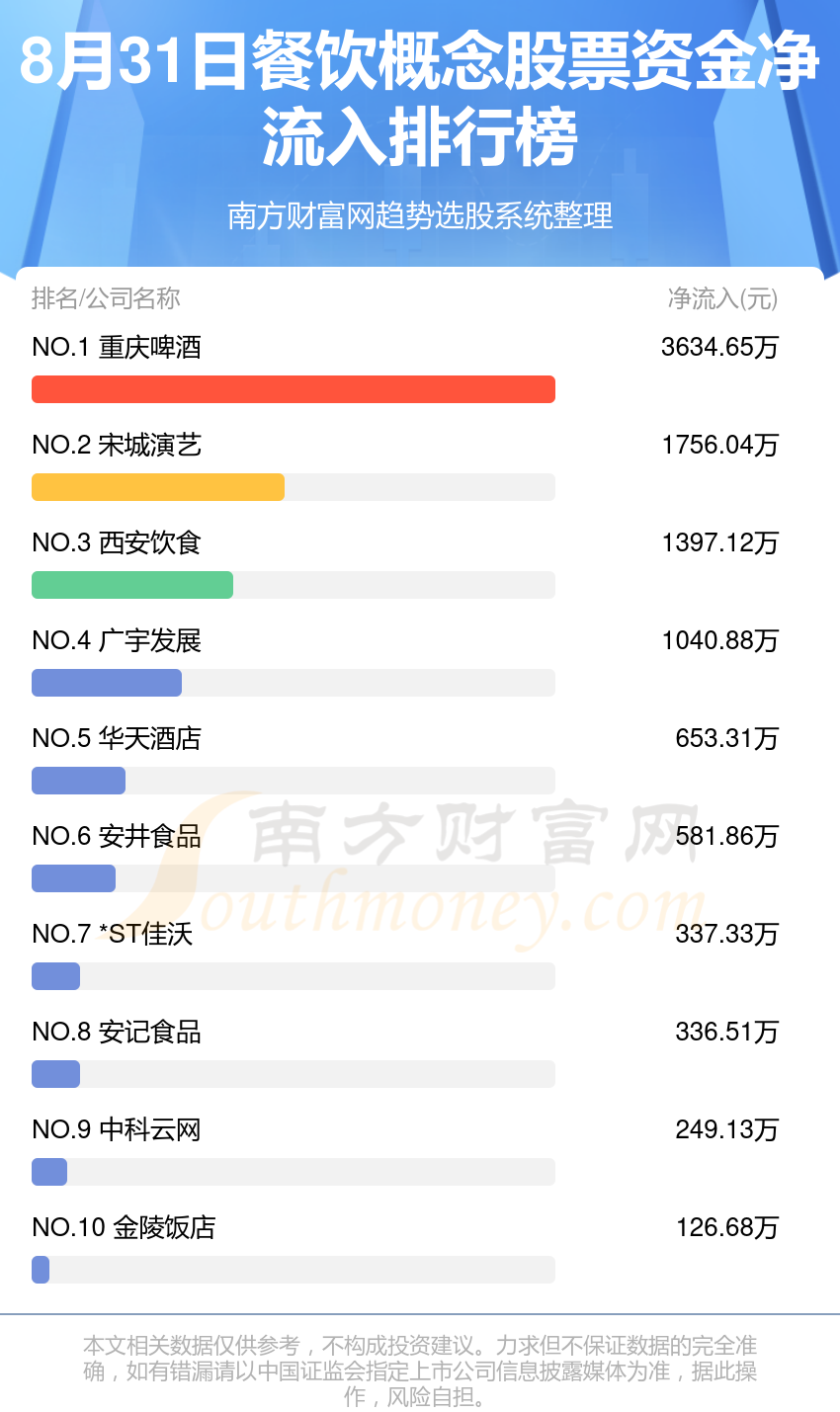 餐饮概念股票8月31日资金净流入情况来看,重庆啤酒位列第一位,主力净流入达到3634.65万元;宋城演艺排名第二,主力净流入为1756.04万元;西安饮食排名第三,主力净流入1397.12万元。主力净流入排名前10的还有:广宇发展、华天酒店、安井食品、*ST佳沃、安记食品、中科云网、金陵饭店。