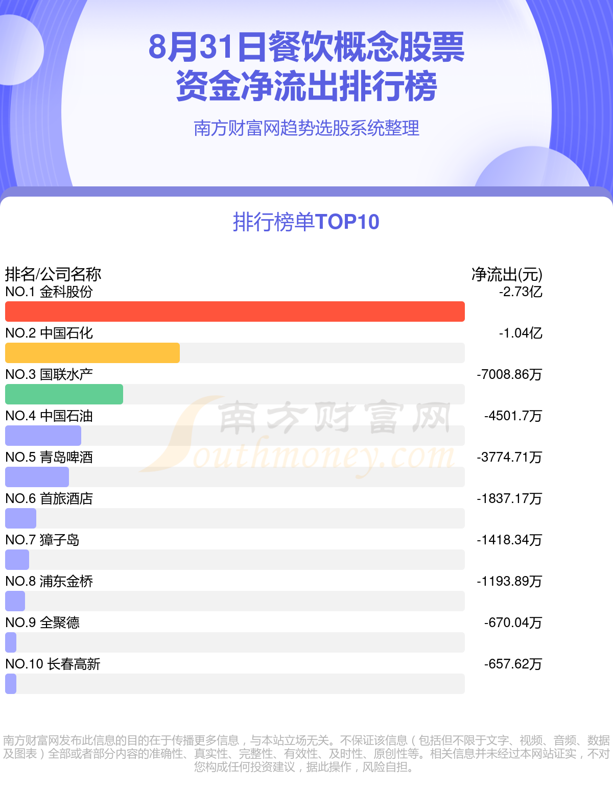 餐饮概念股票8月31日资金净流出情况来看,金科股份位列第一位,主力净流出达到-2.73亿元;中国石化排名第二,主力净流出为-1.04亿元;国联水产排名第三,主力净流出-7008.86万元。主力净流出排名前10的还有:中国石油、青岛啤酒、首旅酒店、獐子岛、浦东金桥、全聚德、长春高新。