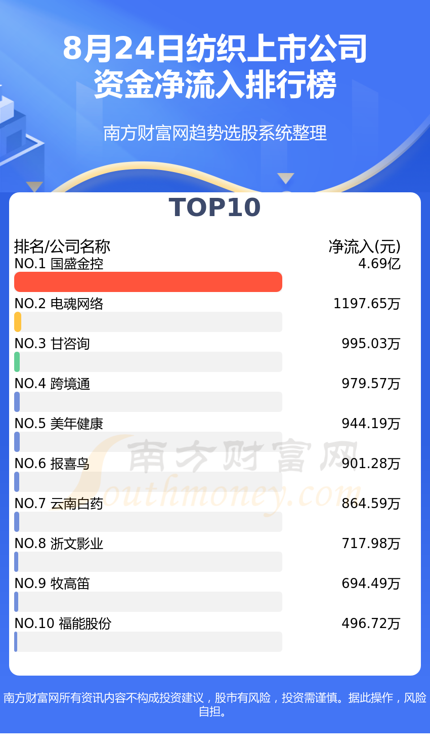 纺织上市公司8月24日资金净流入情况来看,国盛金控位列第一位,主力净流入达到4.69亿元;电魂网络排名第二,主力净流入为1197.65万元;甘咨询排名第三,主力净流入995.03万元。主力净流入排名前10的还有:跨境通、美年健康、报喜鸟、云南白药、浙文影业、牧高笛、福能股份。
