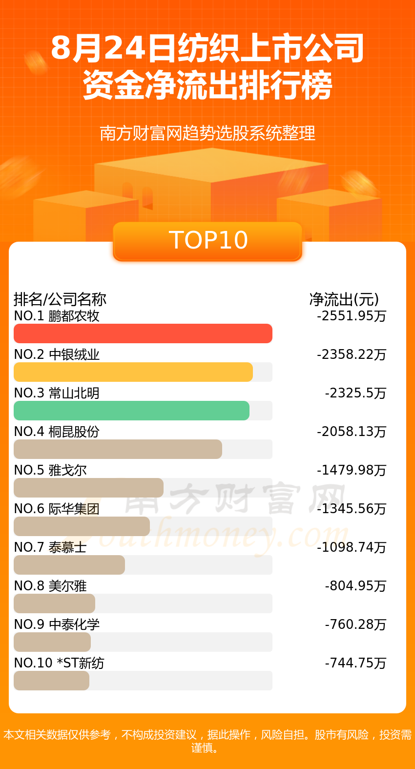 纺织上市公司8月24日资金净流出情况来看,鹏都农牧位列第一位,主力净流出达到-2551.95万元;中银绒业排名第二,主力净流出为-2358.22万元;常山北明排名第三,主力净流出-2325.5万元。主力净流出排名前10的还有:桐昆股份、雅戈尔、际华集团、泰慕士、美尔雅、中泰化学、*ST新纺。