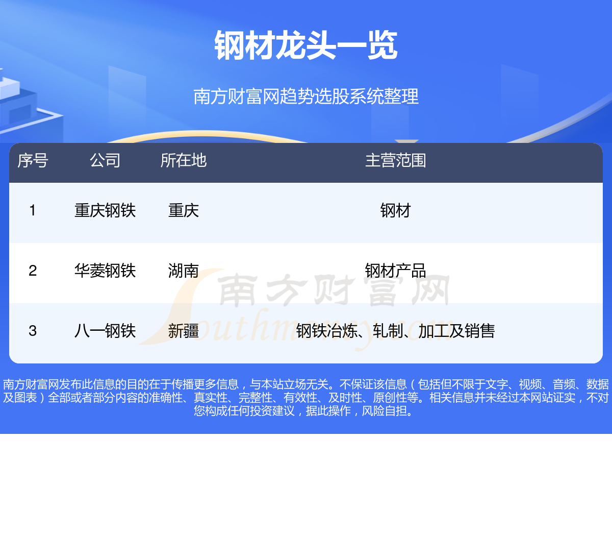 钢材概念股有宝钢股份、中信特钢、包钢股份、华菱钢铁、南钢股份、钒钛股份、首钢股份、永兴材料、河钢股份、太钢不锈等30家上市公司。钢材龙头股是哪几只?趋势选股系统为您整理钢材龙头股的相关信息。