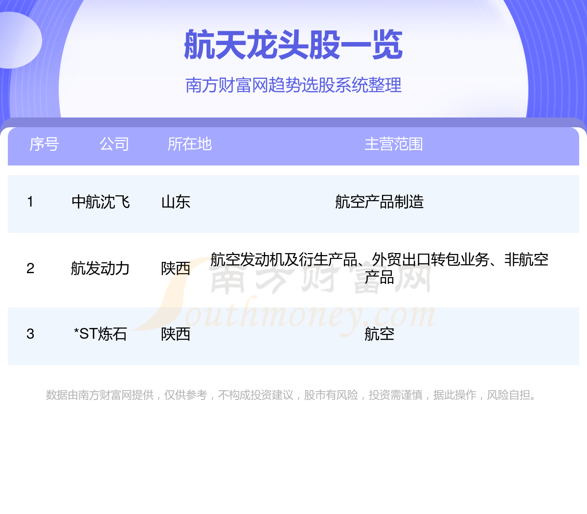 航天概念股有中航沈飞、航发动力、中国重工、中航光电、中国卫通、上海电气、中航机载、中科曙光、金风科技、中航重机等69家上市公司。航天龙头股是哪几只?南方财富网趋势选股系统为您整理航天龙头股的相关信息。