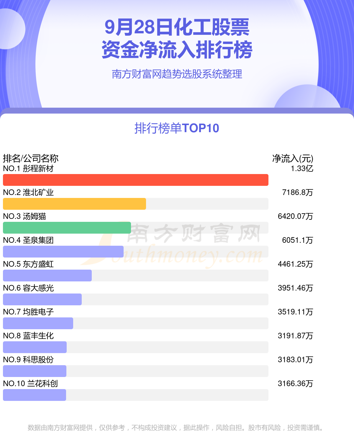 化工股票9月28日资金净流入情况来看,彤程新材位列第一位,主力净流入达到1.33亿元;淮北矿业排名第二,主力净流入为7186.8万元;汤姆猫排名第三,主力净流入6420.07万元。主力净流入排名前10的还有:圣泉集团、东方盛虹、容大感光、均胜电子、蓝丰生化、科思股份、兰花科创。