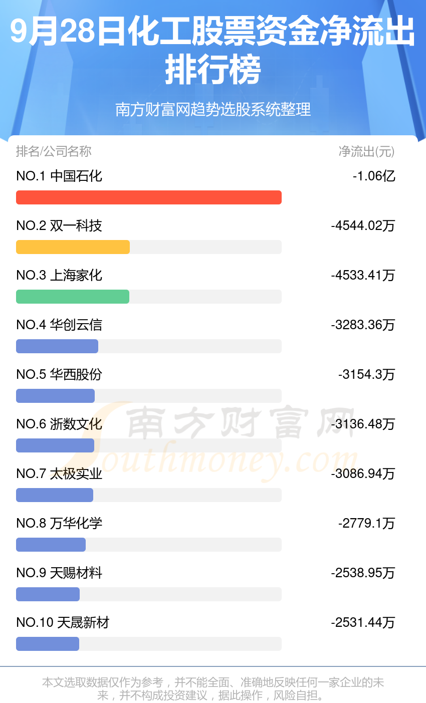 化工股票9月28日资金净流出情况来看,中国石化位列第一位,主力净流出达到-1.06亿元;双一科技排名第二,主力净流出为-4544.02万元;上海家化排名第三,主力净流出-4533.41万元。主力净流出排名前10的还有:华创云信、华西股份、浙数文化、太极实业、万华化学、天赐材料、天晟新材。