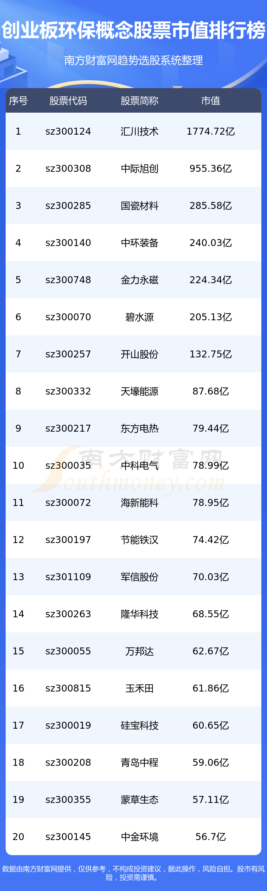 创业板环保概念股票有中电环保、嘉戎技术、巴安水务、津膜科技、碧水源、清水源、开能健康、先河环保、艾布鲁、严牌股份等83家。根据南方财富网趋势选股系统股票工具数据整理,在市值上,截至8月23日,创业板环保概念股票市值排名情况如下: