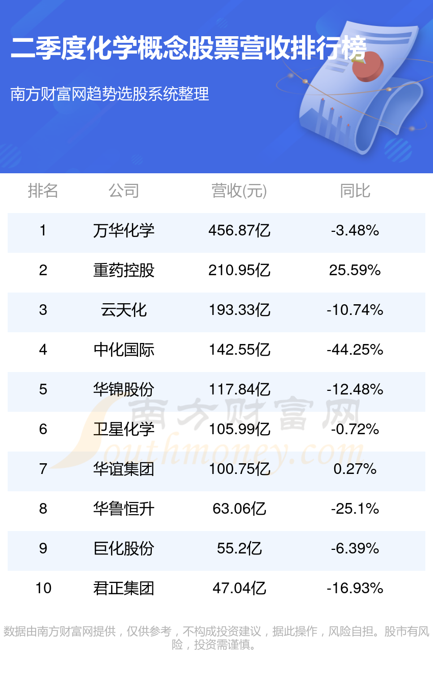 趋势选股系统财报工具数据整理,截至第二季度,化学股营收排行榜中前10依次是:万华化学、重药控股、云天化、中化国际、华锦股份、卫星化学、华谊集团、华鲁恒升、巨化股份、君正集团。