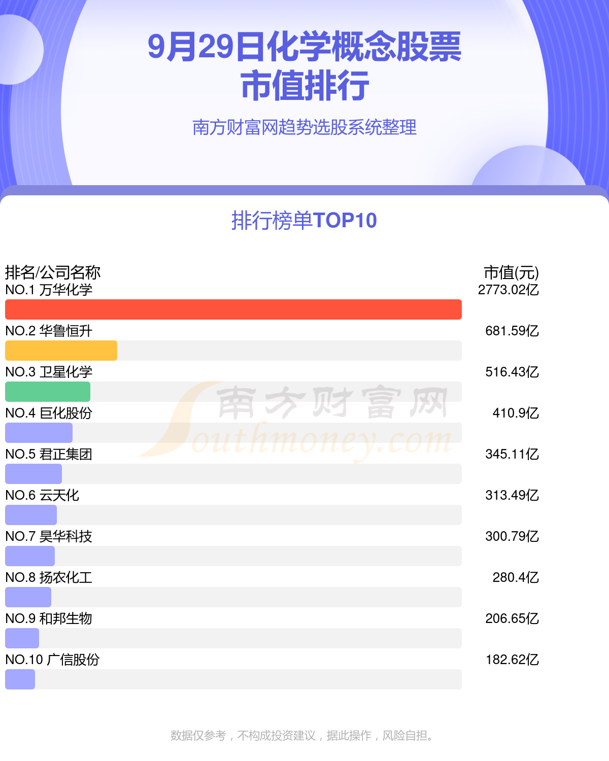 趋势选股系统股票工具数据整理,截至9月29日,化学上市公司市值排行榜中,万华化学位列第一位,市值达到2773.02亿元;华鲁恒升排名第二,市值为681.59亿元;卫星化学排名第三,市值516.43亿元。市值排名前10的还有:巨化股份、君正集团、云天化、昊华科技、扬农化工、和邦生物、广信股份。