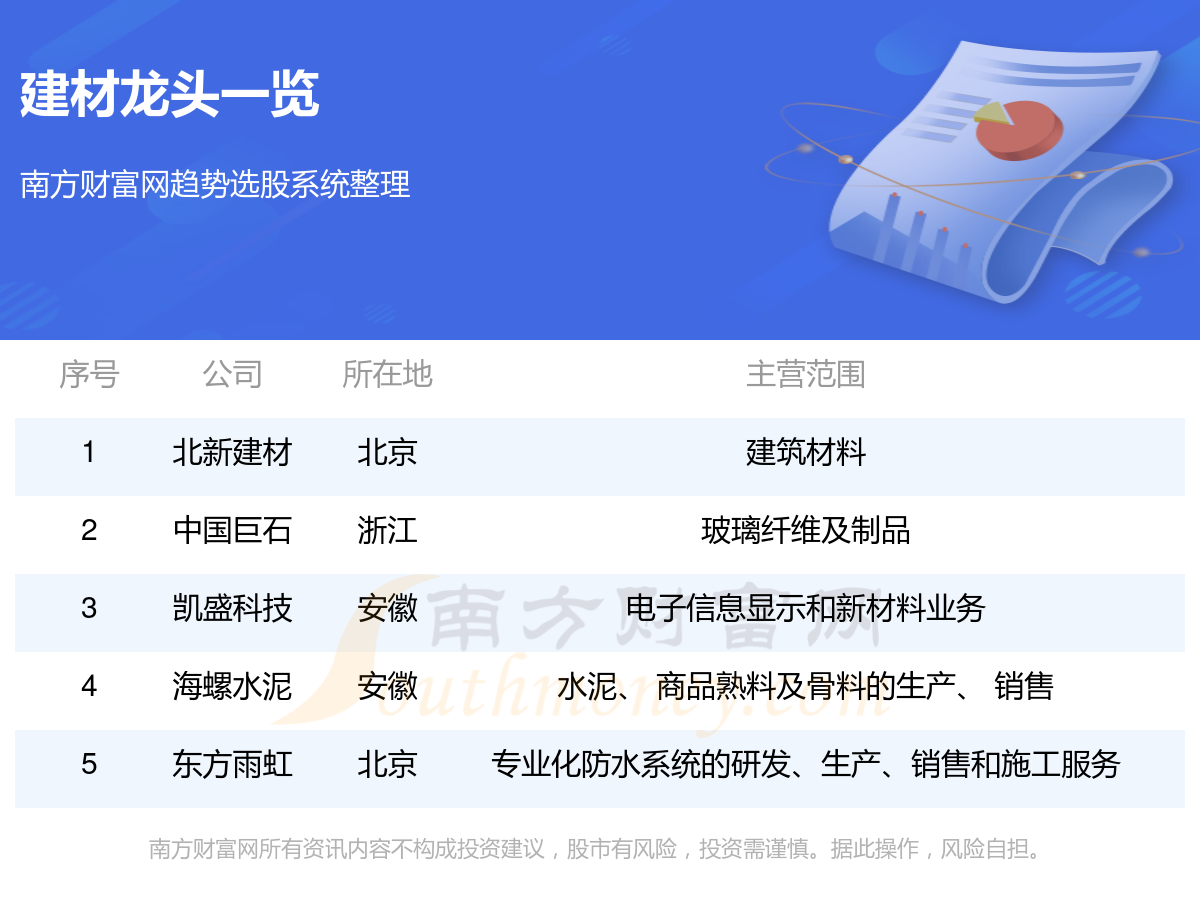 建材概念股有海螺水泥、福耀玻璃、东方雨虹、福莱特、天山股份、中国巨石、北新建材、三棵树、中材科技、伟星新材等133家上市公司。建材龙头股是哪几只?《南方财富网趋势选股系统》为您整理建材龙头股的相关信息。