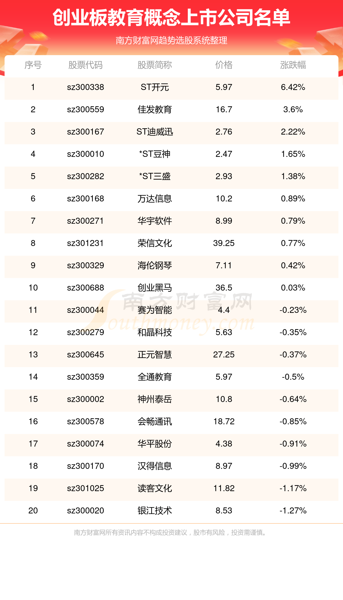 截至9月1日,创业板教育概念上市公司有ST开元、佳发教育、ST迪威迅、*ST豆神、*ST三盛、万达信息、华宇软件、荣信文化、海伦钢琴、创业黑马等30家。以下是趋势选股系统为您整理的创业板教育概念上市公司的详细介绍。