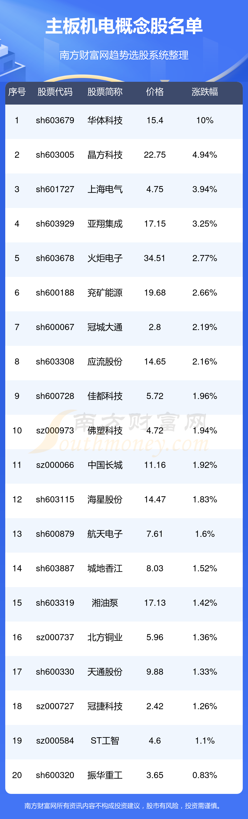 截至9月6日,主板机电概念股有华体科技、晶方科技、上海电气、亚翔集成、火炬电子、兖矿能源、冠城大通、应流股份、佳都科技、佛塑科技等51家。以下是南方财富网趋势选股系统为您整理的主板机电概念股的详细介绍。