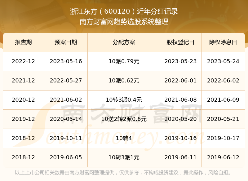 浙江东方最新一次公布的分红方案为10派0.79元。本次权益分派股权登记日为2023年5月23日,除权除息日为2023年5月24日,派息日为2023年5月24日。