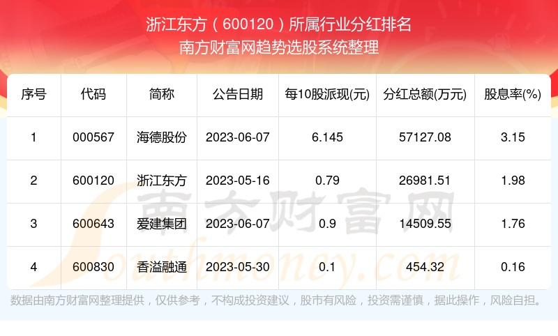 按照南方财富网趋势选股系统统计,浙江东方所属行业为多元金融行业,多元金融行业分红排名情况如下表: