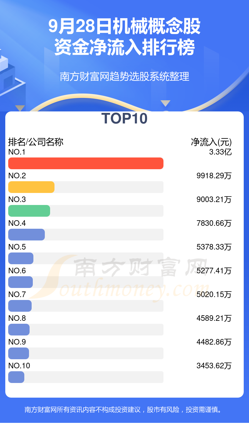 机械概念股9月28日资金净流入情况来看,北方华创位列第一位,主力净流入达到3.33亿元;联得装备排名第二,主力净流入为9918.29万元;紫天科技排名第三,主力净流入9003.21万元。主力净流入排名前10的还有:金自天正、蓝英装备、林州重机、赢合科技、中大力德、安徽合力、亚威股份。