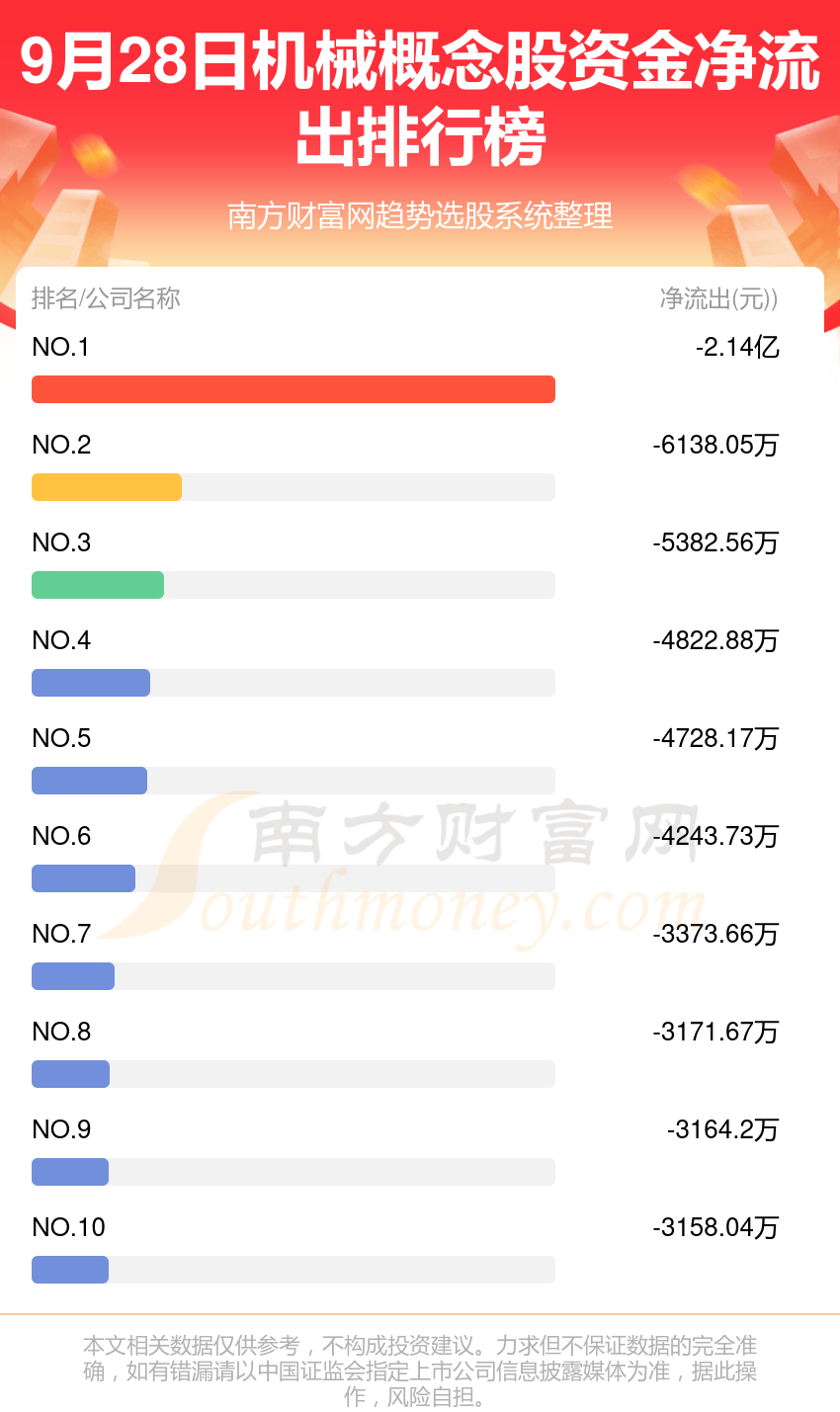 机械概念股9月28日资金净流出情况来看,德恩精工位列第一位,主力净流出达到-2.14亿元;建科机械排名第二,主力净流出为-6138.05万元;华明装备排名第三,主力净流出-5382.56万元。主力净流出排名前10的还有:中国动力、拓斯达、昊志机电、秦川机床、华东数控、三一重工、机器人。