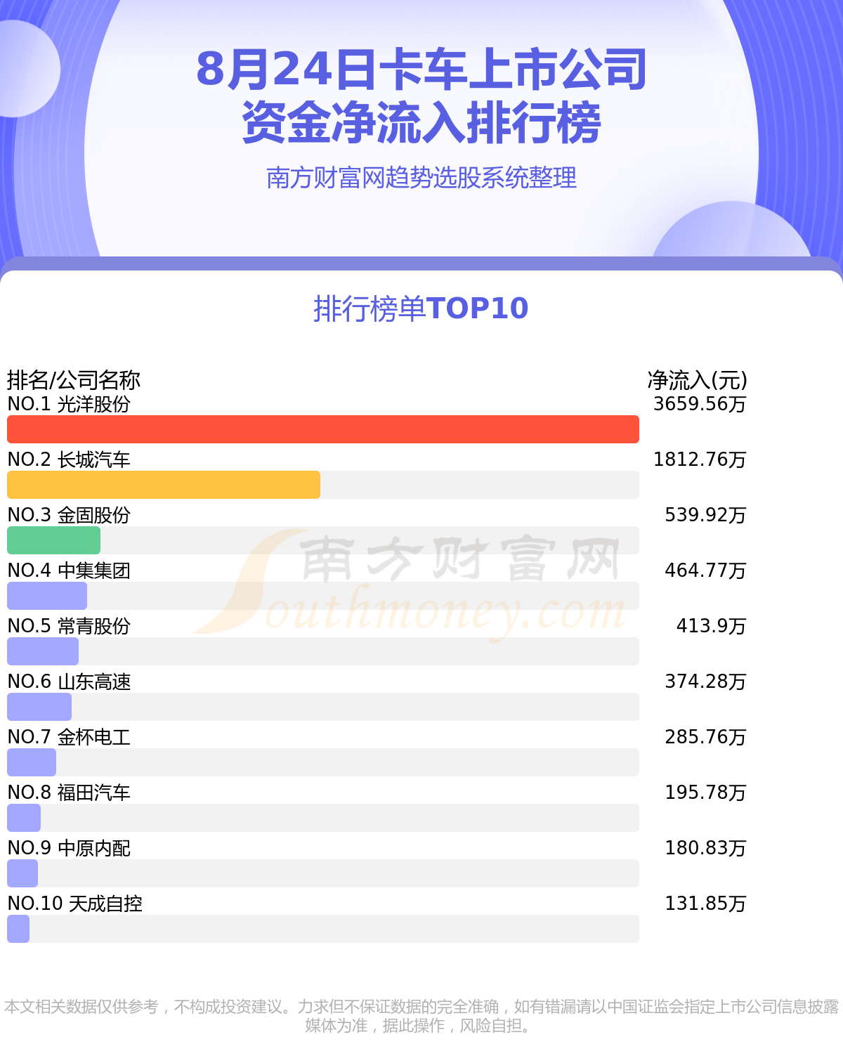 卡车上市公司8月24日资金净流入情况来看,光洋股份位列第一位,主力净流入达到3659.56万元;长城汽车排名第二,主力净流入为1812.76万元;金固股份排名第三,主力净流入539.92万元。主力净流入排名前10的还有:中集集团、常青股份、山东高速、金杯电工、福田汽车、中原内配、天成自控。