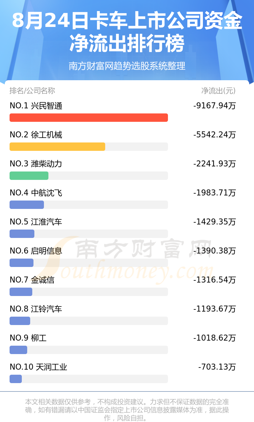 卡车上市公司8月24日资金净流出情况来看,兴民智通位列第一位,主力净流出达到-9167.94万元;徐工机械排名第二,主力净流出为-5542.24万元;潍柴动力排名第三,主力净流出-2241.93万元。主力净流出排名前10的还有:中航沈飞、江淮汽车、启明信息、金诚信、江铃汽车、柳工、天润工业。