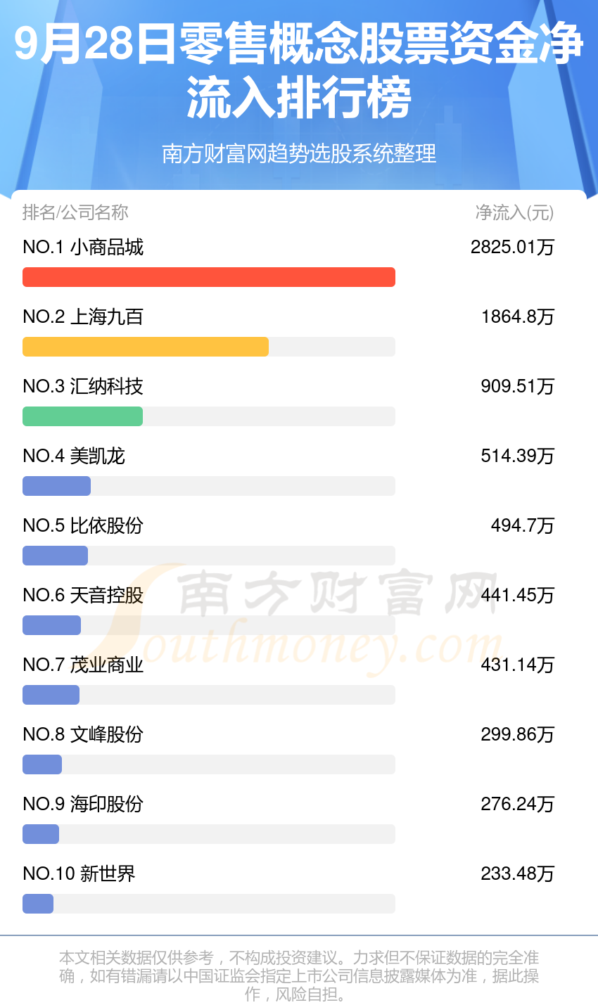 零售概念股票9月28日资金净流入情况来看,小商品城位列第一位,主力净流入达到2825.01万元;上海九百排名第二,主力净流入为1864.8万元;汇纳科技排名第三,主力净流入909.51万元。主力净流入排名前10的还有:美凯龙、比依股份、天音控股、茂业商业、文峰股份、海印股份、新世界。