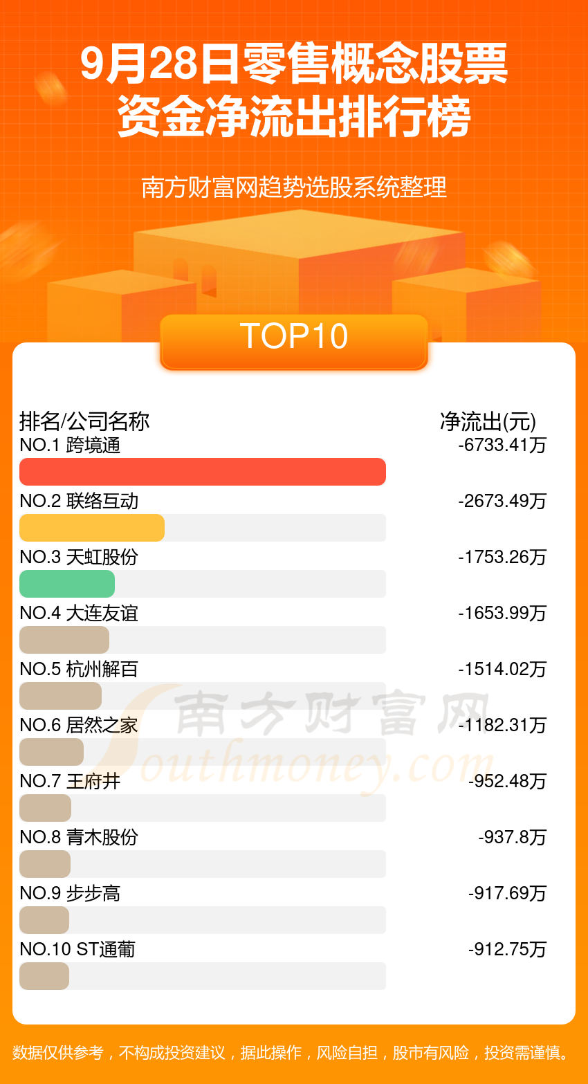 零售概念股票9月28日资金净流出情况来看,跨境通位列第一位,主力净流出达到-6733.41万元;联络互动排名第二,主力净流出为-2673.49万元;天虹股份排名第三,主力净流出-1753.26万元。主力净流出排名前10的还有:大连友谊、杭州解百、居然之家、王府井、青木股份、步步高、ST通葡。