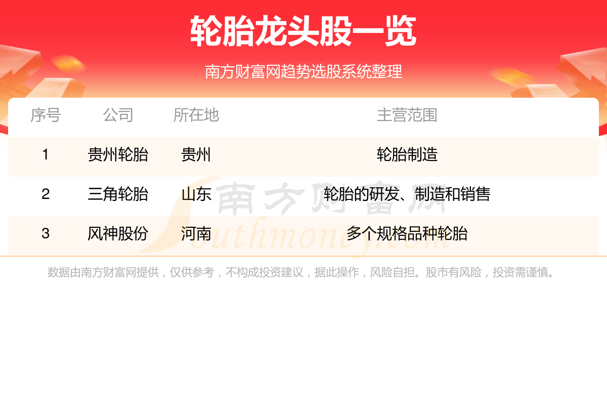 轮胎概念股有长城汽车、上汽集团、长安汽车、广汽集团、合盛硅业、宇通客车、赛轮轮胎、北汽蓝谷、一汽解放、华峰化学等57家上市公司。轮胎龙头股是哪几只?趋势选股系统为您整理轮胎龙头股的相关信息。