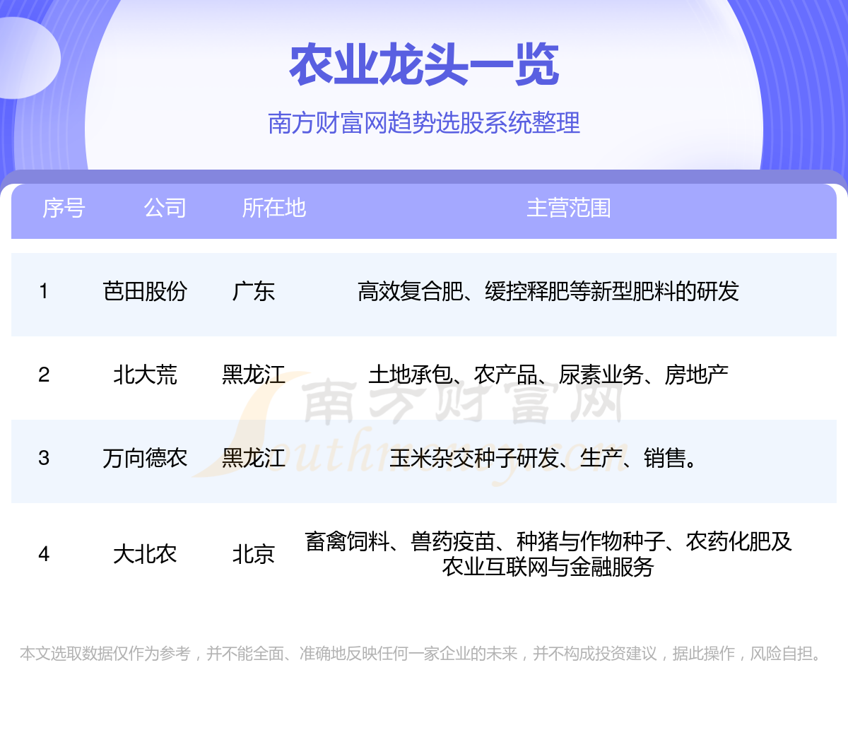 农业概念股有牧原股份、通威股份、温氏股份、三安光电、安琪酵母、大北农、梅花生物、亚钾国际、圣农发展、北大荒等93家上市公司。农业龙头股是哪几只?趋势选股系统为您整理农业龙头股的相关信息。