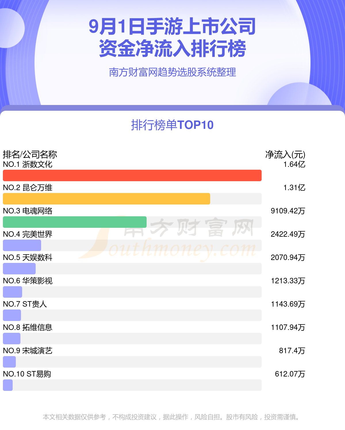 手游上市公司9月1日资金净流入情况来看,浙数文化位列第一位,主力净流入达到1.64亿元;昆仑万维排名第二,主力净流入为1.31亿元;电魂网络排名第三,主力净流入9109.42万元。主力净流入排名前10的还有:完美世界、天娱数科、华策影视、ST贵人、拓维信息、宋城演艺、ST易购。