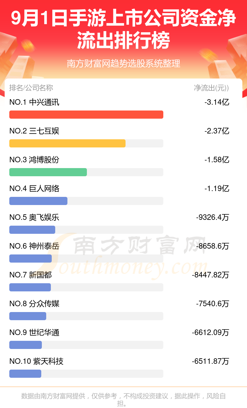 手游上市公司9月1日资金净流出情况来看,中兴通讯位列第一位,主力净流出达到-3.14亿元;三七互娱排名第二,主力净流出为-2.37亿元;鸿博股份排名第三,主力净流出-1.58亿元。主力净流出排名前10的还有:巨人网络、奥飞娱乐、神州泰岳、新国都、分众传媒、世纪华通、紫天科技。