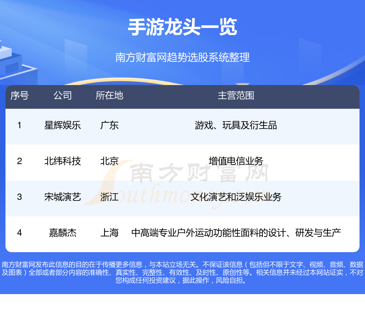 手游概念股有中兴通讯、分众传媒、东方证券、三六零、三七互娱、昆仑万维、世纪华通、宋城演艺、恺英网络、吉比特等105家上市公司。手游龙头股是哪几只?南方财富网趋势选股系统为您整理手游龙头股的相关信息。