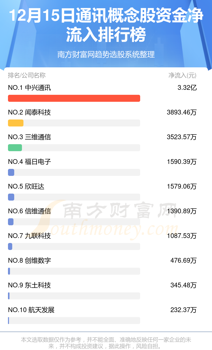 通讯概念股12月15日资金净流入情况来看,中兴通讯位列第一位,主力净流入达到3.32亿元;闻泰科技排名第二,主力净流入为3893.46万元;三维通信排名第三,主力净流入3523.57万元。主力净流入排名前10的还有:福日电子、欣旺达、信维通信、九联科技、创维数字、东土科技、航天发展。