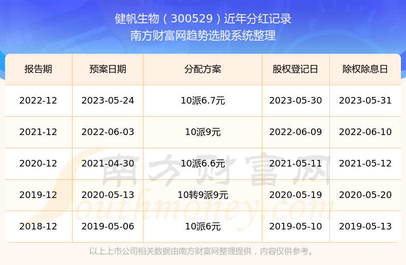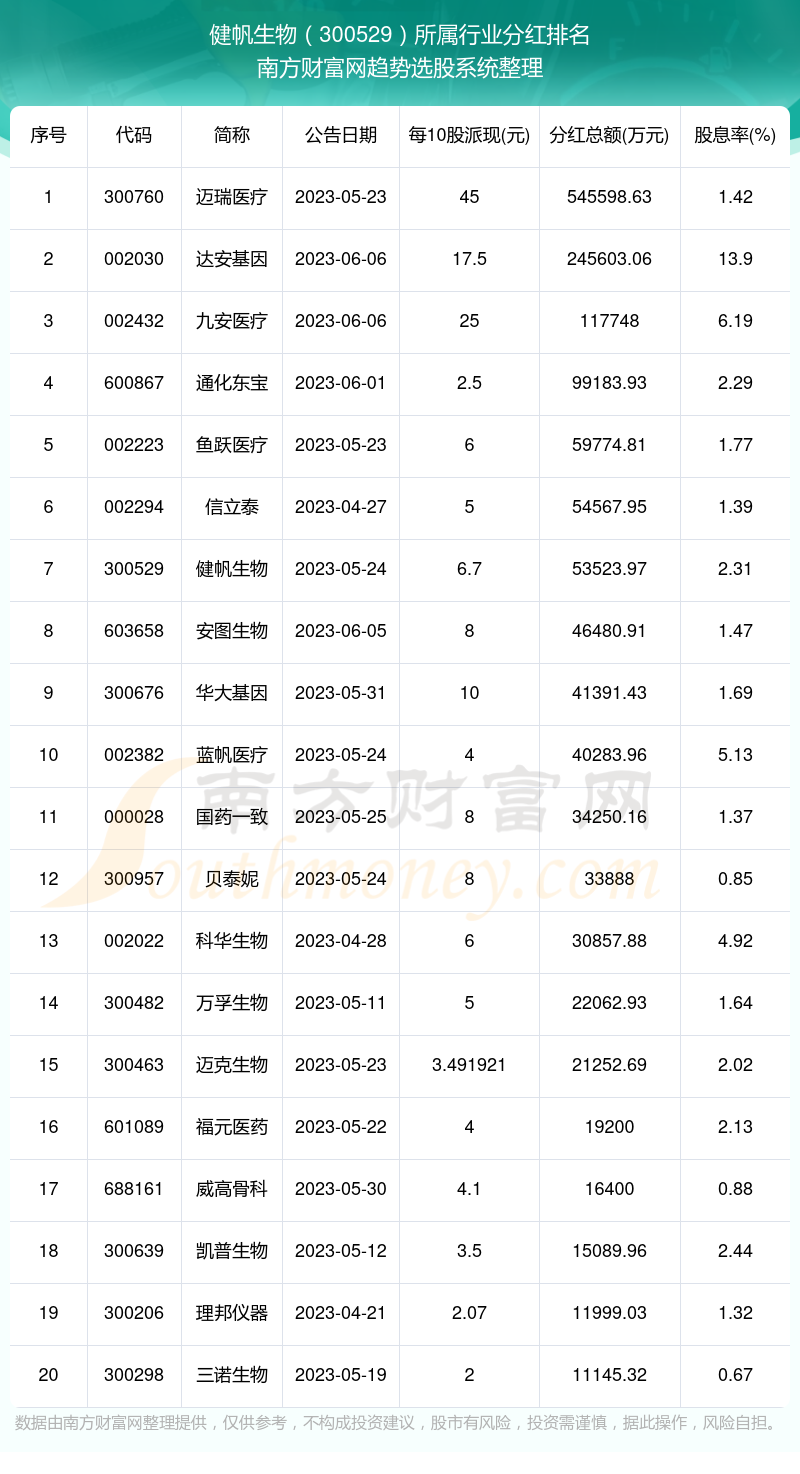 二、健帆生物300529行业分红排名