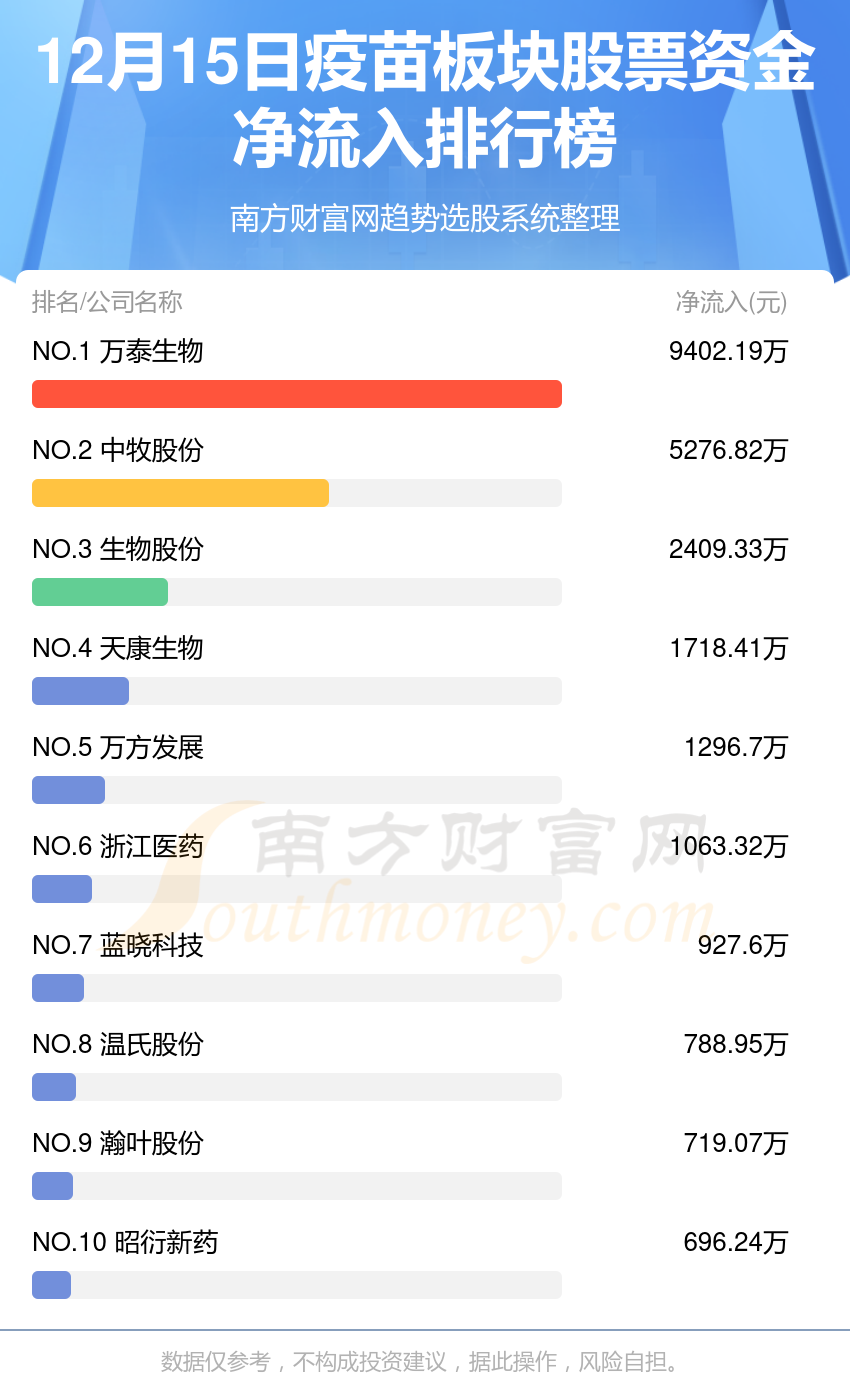 疫苗板块股票12月15日资金净流入情况来看,万泰生物位列第一位,主力净流入达到9402.19万元;中牧股份排名第二,主力净流入为5276.82万元;生物股份排名第三,主力净流入2409.33万元。主力净流入排名前10的还有:天康生物、万方发展、浙江医药、蓝晓科技、温氏股份、瀚叶股份、昭衍新药。