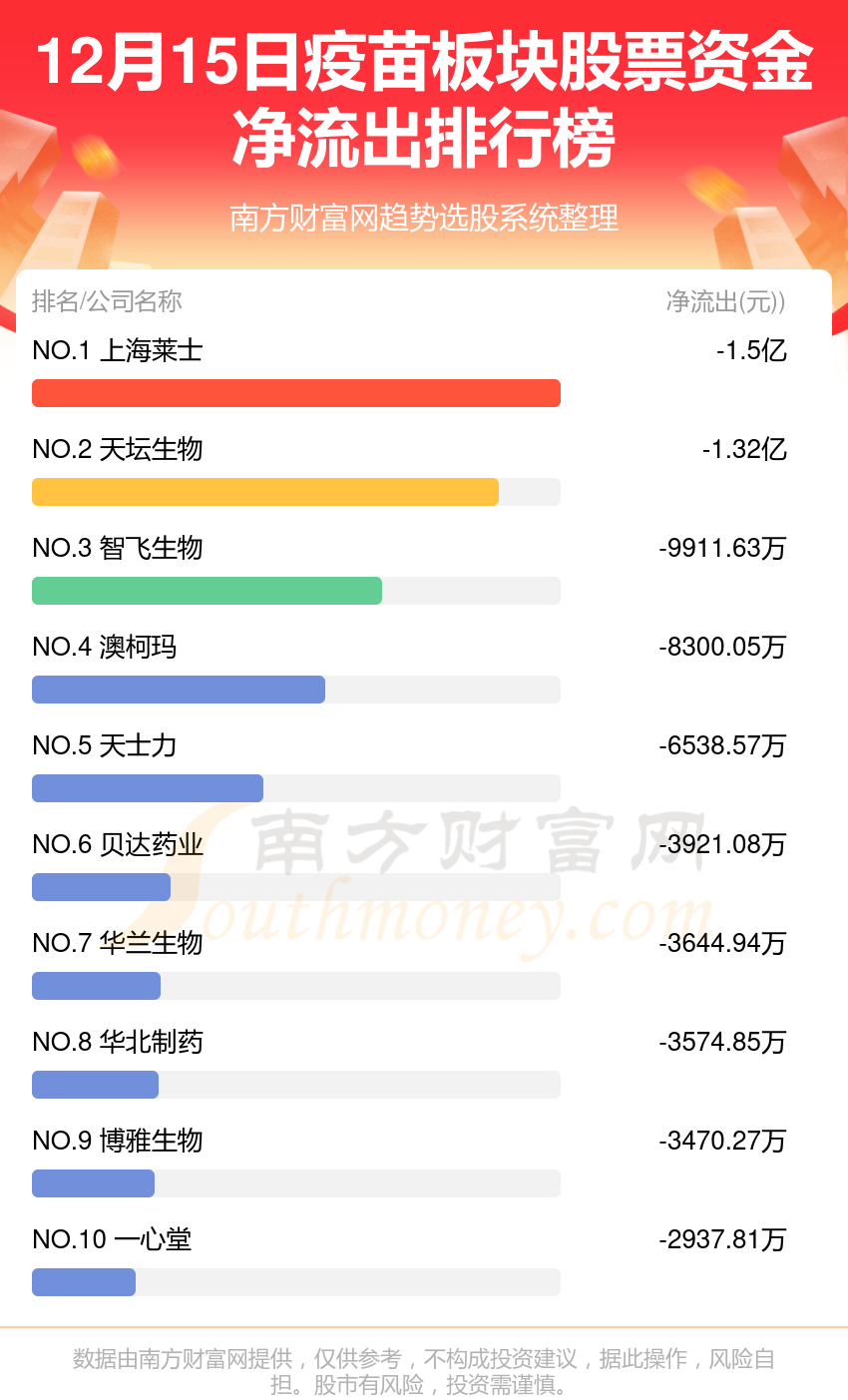 疫苗板块股票12月15日资金净流出情况来看,上海莱士位列第一位,主力净流出达到-1.5亿元;天坛生物排名第二,主力净流出为-1.32亿元;智飞生物排名第三,主力净流出-9911.63万元。主力净流出排名前10的还有:澳柯玛、天士力、贝达药业、华兰生物、华北制药、博雅生物、一心堂。