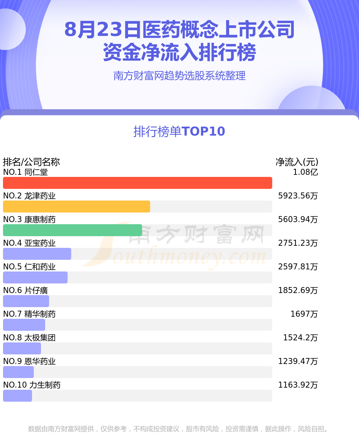 医药概念上市公司8月23日资金净流入情况来看,同仁堂位列第一位,主力净流入达到1.08亿元;龙津药业排名第二,主力净流入为5923.56万元;康惠制药排名第三,主力净流入5603.94万元。主力净流入排名前10的还有:亚宝药业、仁和药业、片仔癀、精华制药、太极集团、恩华药业、力生制药。