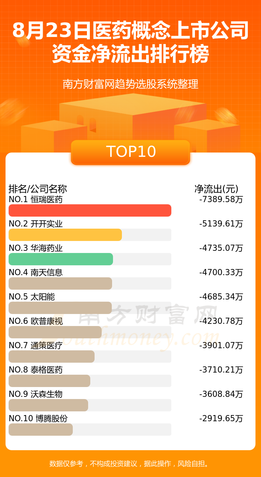 医药概念上市公司8月23日资金净流出情况来看,恒瑞医药位列第一位,主力净流出达到-7389.58万元;开开实业排名第二,主力净流出为-5139.61万元;华海药业排名第三,主力净流出-4735.07万元。主力净流出排名前10的还有:南天信息、太阳能、欧普康视、通策医疗、泰格医药、沃森生物、博腾股份。