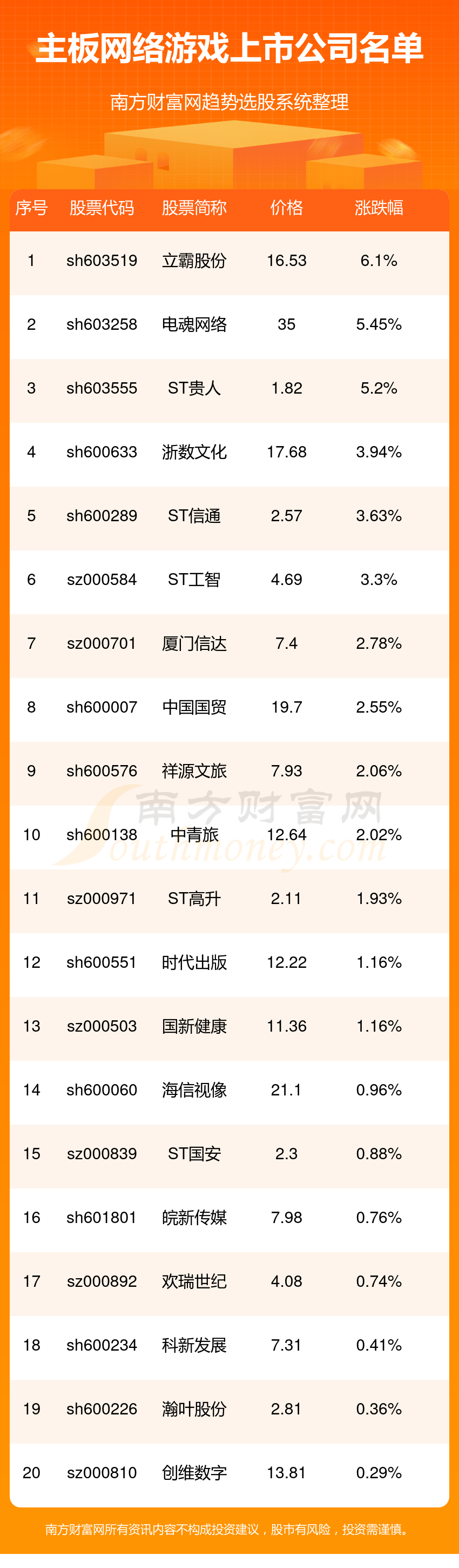 截至9月1日,主板网络游戏上市公司有立霸股份、电魂网络、ST贵人、浙数文化、ST信通、ST工智、厦门信达、中国国贸、祥源文旅、中青旅等55家。以下是《南方财富网趋势选股系统》为您整理的主板网络游戏上市公司的详细介绍。