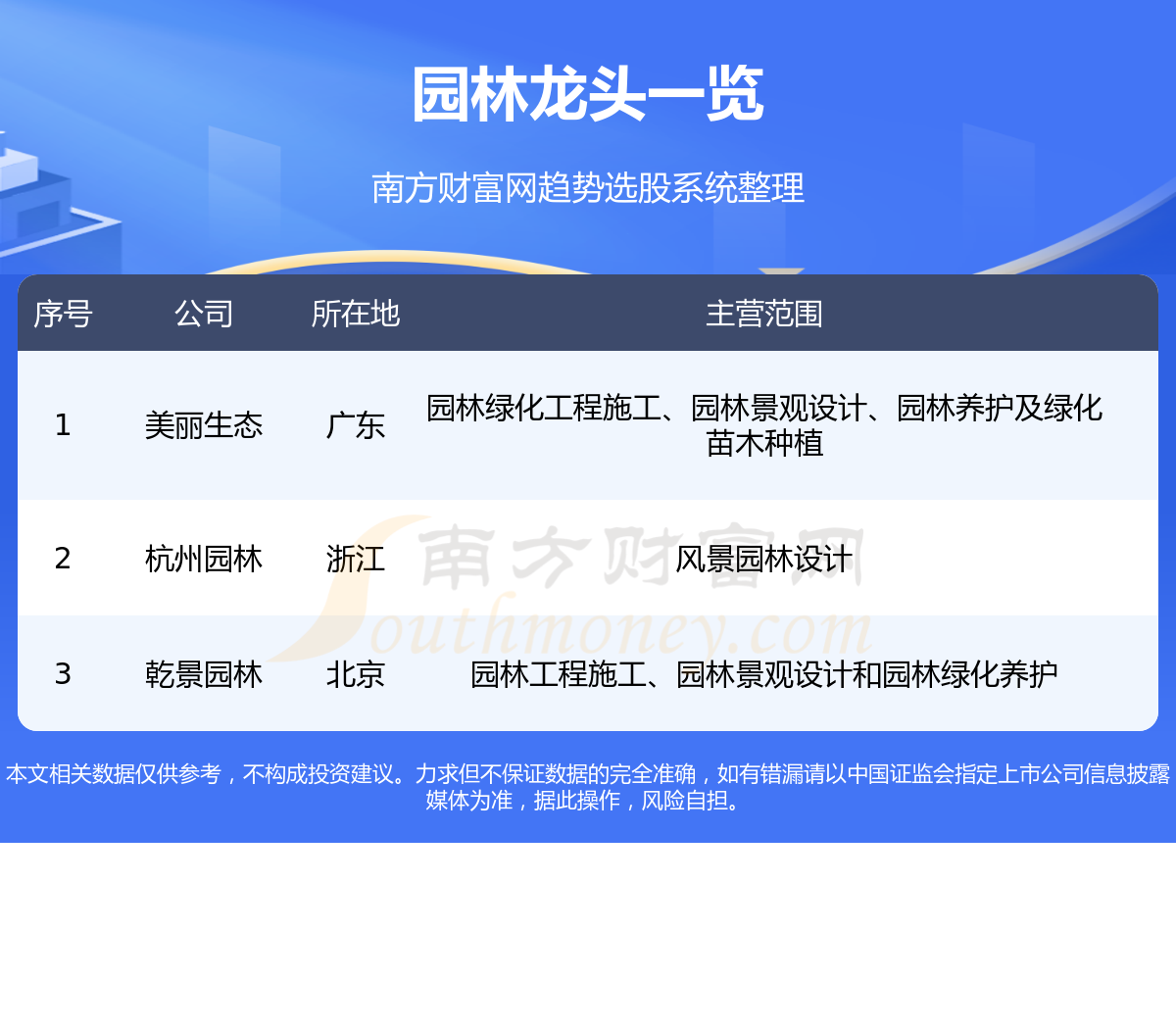园林概念股有岳阳林纸、节能铁汉、岭南股份、棕榈股份、东珠生态、农尚环境、乾景园林、美丽生态、绿茵生态、中装建设等16家上市公司。园林龙头股是哪几只?南方财富网趋势选股系统为您整理园林龙头股的相关信息。