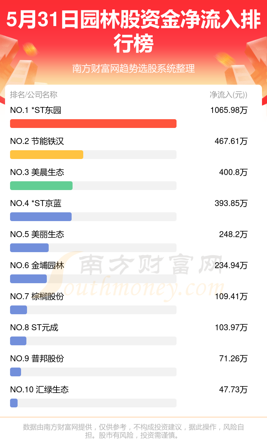 园林股5月31日资金净流入情况来看,东方园林位列第一位,主力净流入达到1065.98万元;节能铁汉排名第二,主力净流入为467.61万元;美晨生态排名第三,主力净流入400.8万元。主力净流入排名前10的还有:*ST京蓝、美丽生态、金埔园林、棕榈股份、元成股份、普邦股份、汇绿生态。