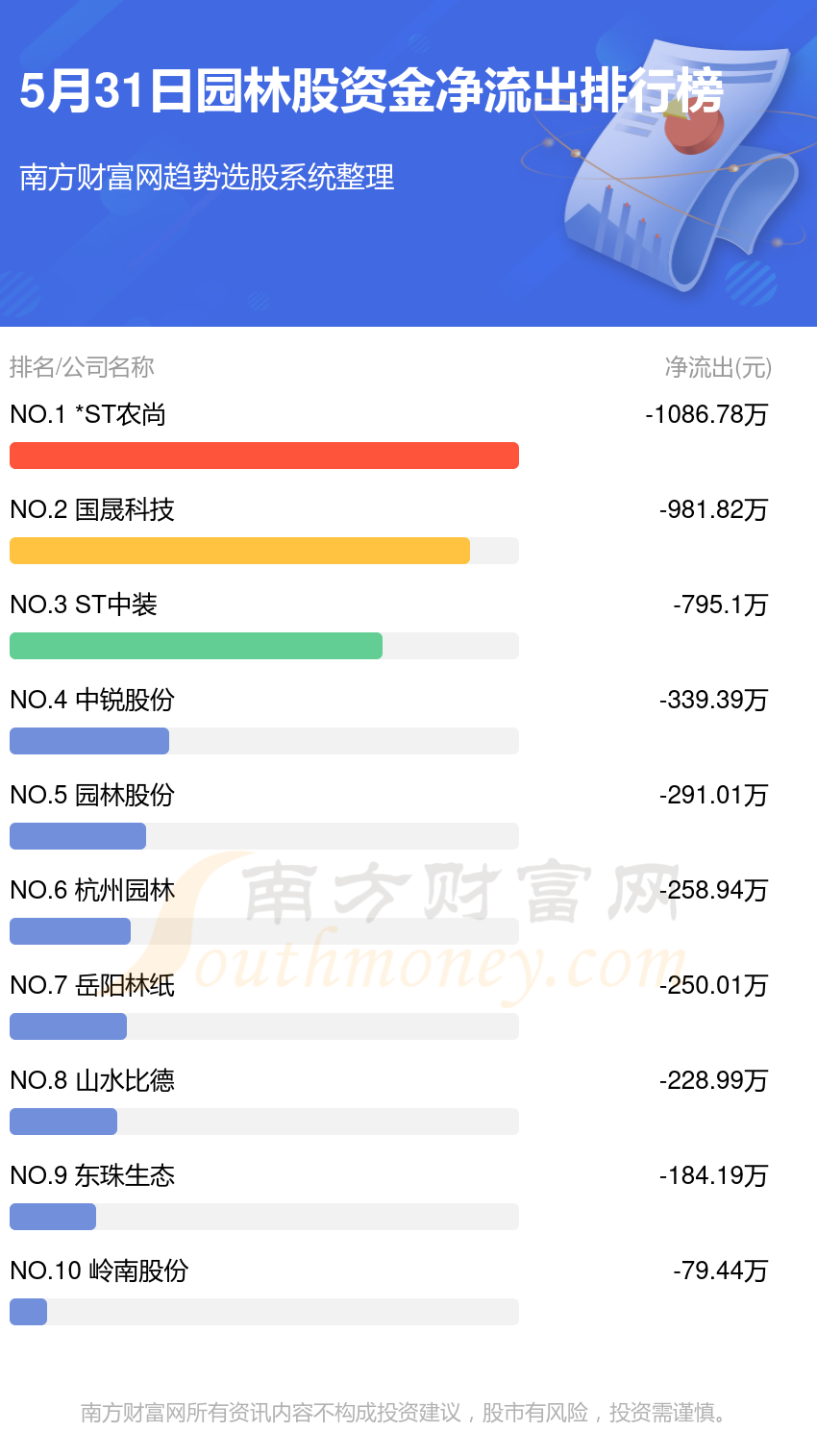 园林股5月31日资金净流出情况来看,农尚环境位列第一位,主力净流出达到-1086.78万元;乾景园林排名第二,主力净流出为-981.82万元;中装建设排名第三,主力净流出-795.1万元。主力净流出排名前10的还有:中锐股份、园林股份、杭州园林、岳阳林纸、山水比德、东珠生态、岭南股份。