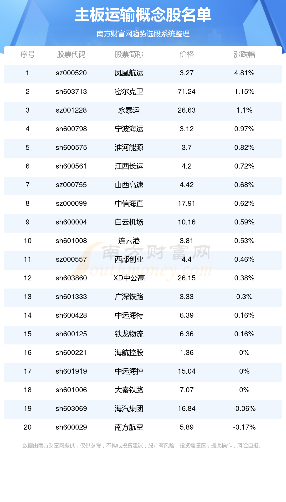 截至5月31日,主板运输概念股有凤凰航运、密尔克卫、永泰运、宁波海运、淮河能源、江西长运、山西高速、中信海直、白云机场、连云港等33家。以下是趋势选股系统为您整理的主板运输概念股的详细介绍。