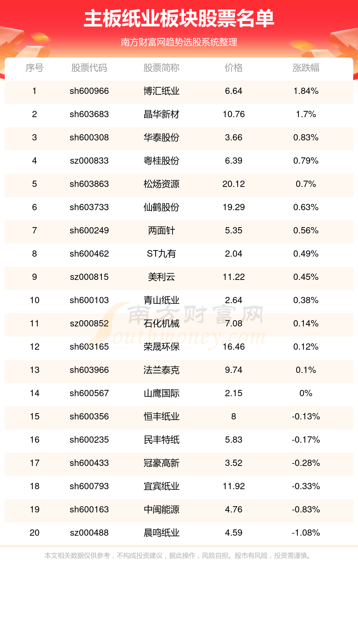 截至9月6日,主板纸业板块股票有博汇纸业、晶华新材、华泰股份、粤桂股份、松炀资源、仙鹤股份、两面针、ST九有、美利云、青山纸业等23家。以下是趋势选股系统为您整理的主板纸业板块股票的详细介绍。