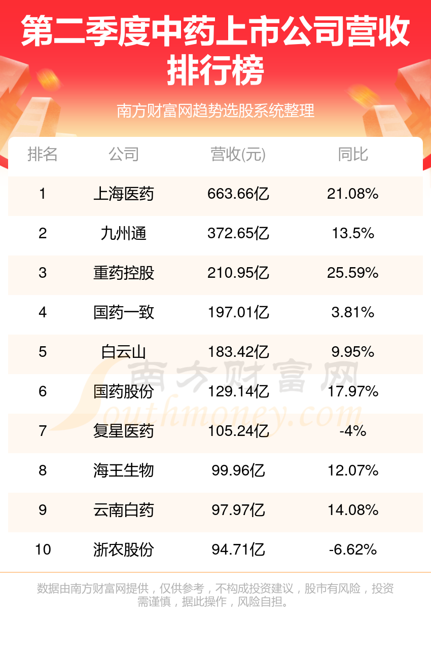 趋势选股系统财报工具数据整理,截至2023年第二季度,中药股营收排行榜中前10依次是:上海医药、九州通、重药控股、国药一致、白云山、国药股份、复星医药、海王生物、云南白药、浙农股份。