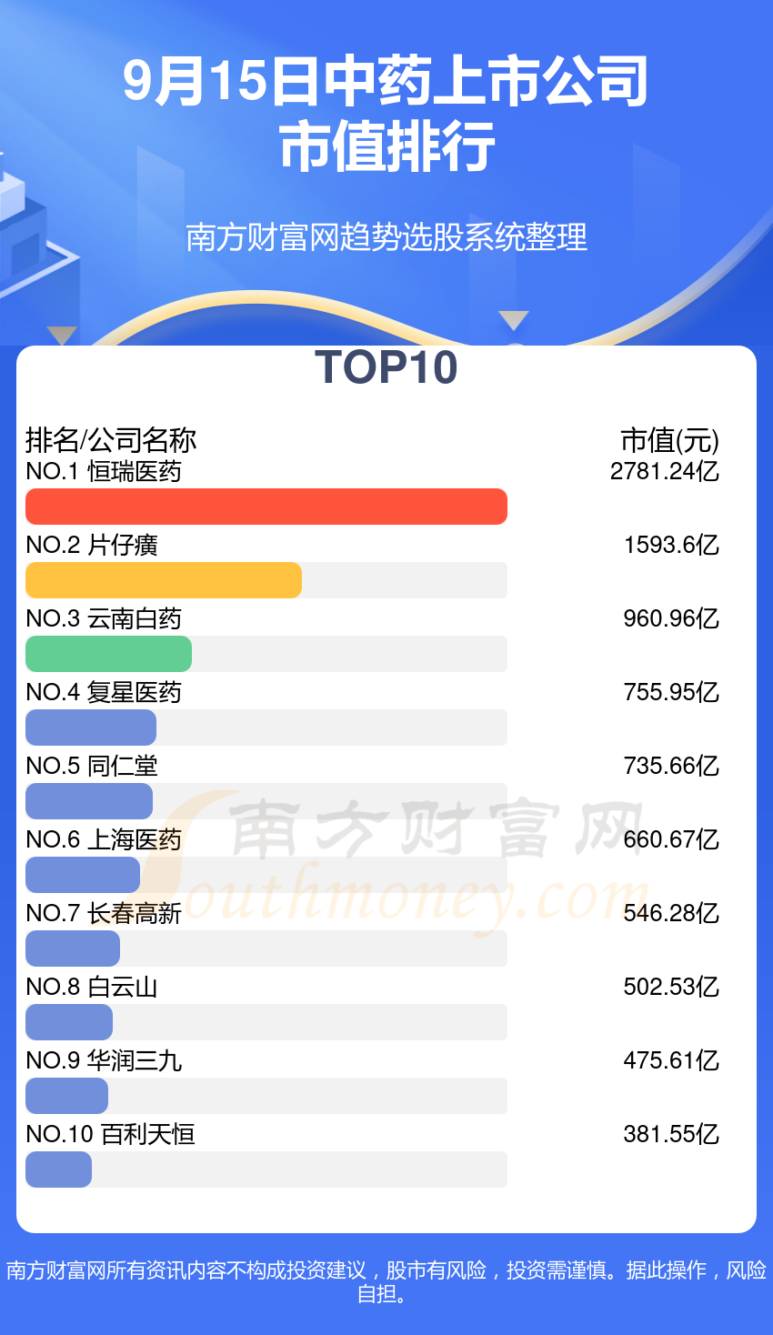 趋势选股系统股票工具数据整理,截至9月15日,中药上市公司市值排行榜中,恒瑞医药位列第一位,市值达到2781.24亿元;片仔癀排名第二,市值为1593.6亿元;云南白药排名第三,市值960.96亿元。市值排名前10的还有:复星医药、同仁堂、上海医药、长春高新、白云山、华润三九、百利天恒。